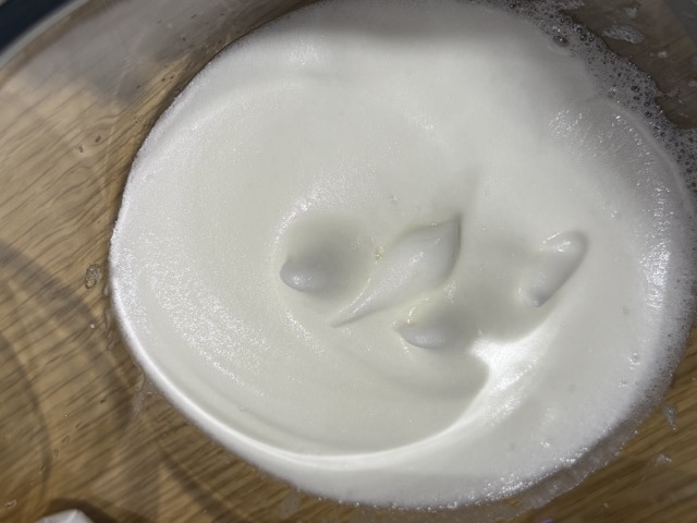 - 加入剩下的糖(10g),一樣中速打發到泡泡比細緻,就要開始注意不過過頭,拉起來是蛋白要能彎彎的