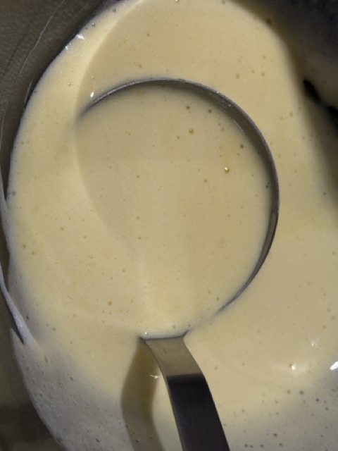 - 先把打發後的,蛋白加入1/3至蛋黃,攪均 (切半攪,不要過頭)